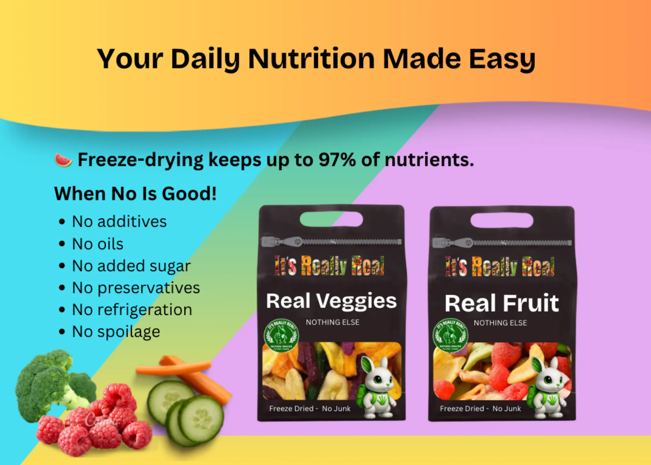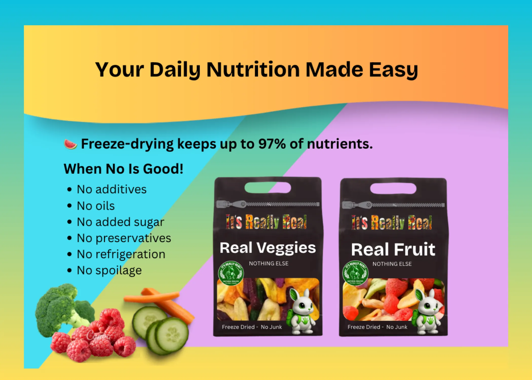 - A mix of natural colors (no artificial dyes — real fruit, real veggies, real ingredients)